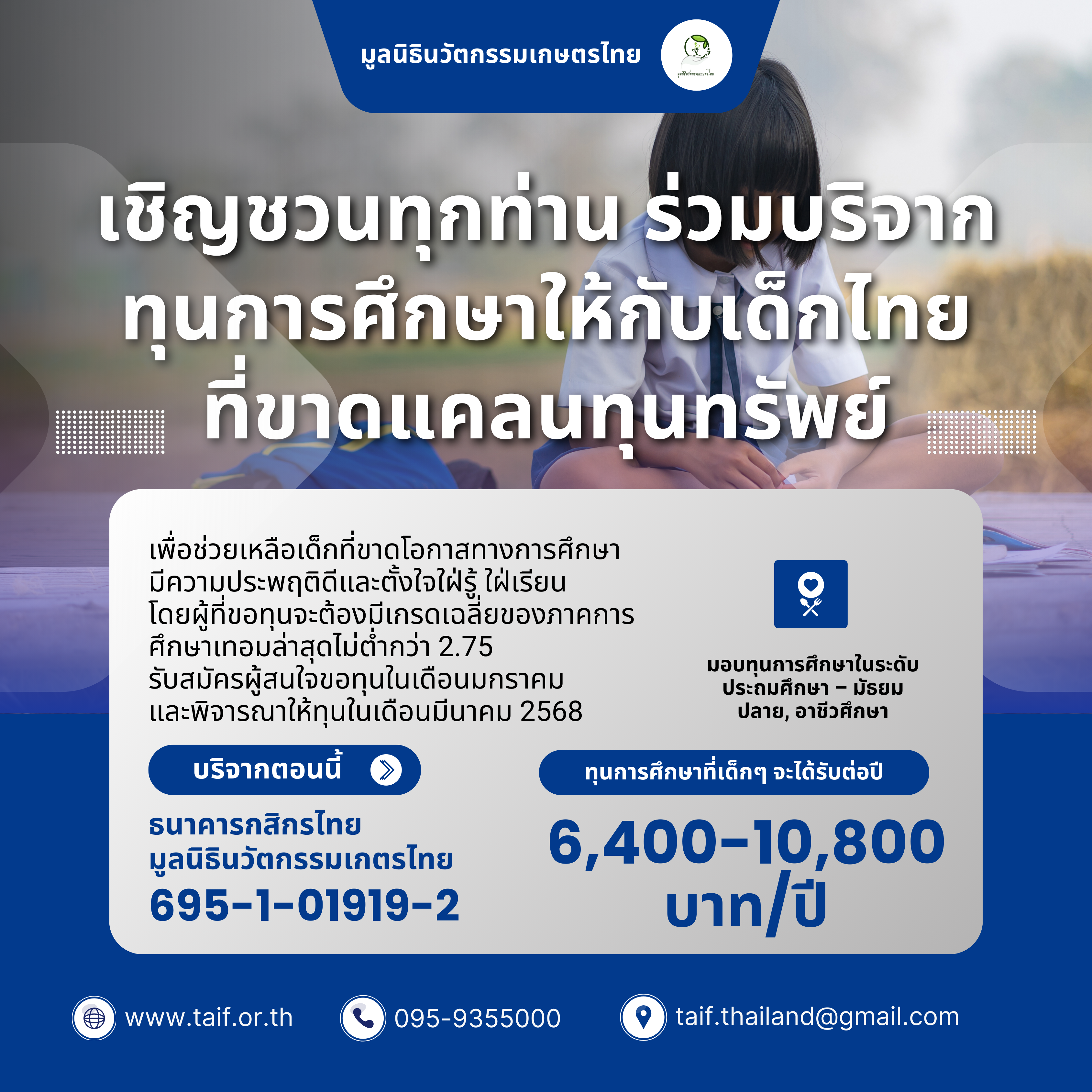 ขอเชิญร่วมบริจาคทุนการศึกษาเพื่อเด็กไทยที่ขาดแคลน